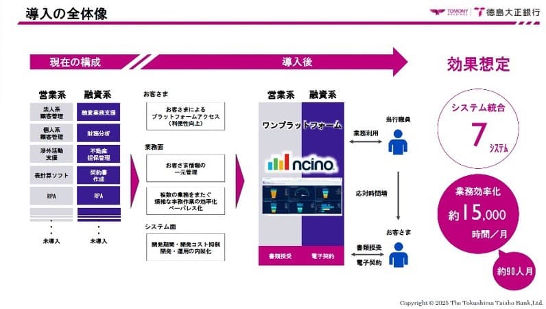 徳島大正銀行では、現行の7システムをnCinoに統合することで、営業店における業務効率化を実現し、1カ月あたりおよそ15,000時間、90人月分の期待効果が得られると試算している。「商売はお客様がいて初めて成り立つ。最前線に立つ営業店の行員が、顧客接点の時間を増やすことにやりがいを感じ、お客様に恥ずかしくない商品、サービスを提供する。営業店を効率化し、本業に集中できる環境をいかに作れるかが重要だと思う」と西村氏は語っていた。